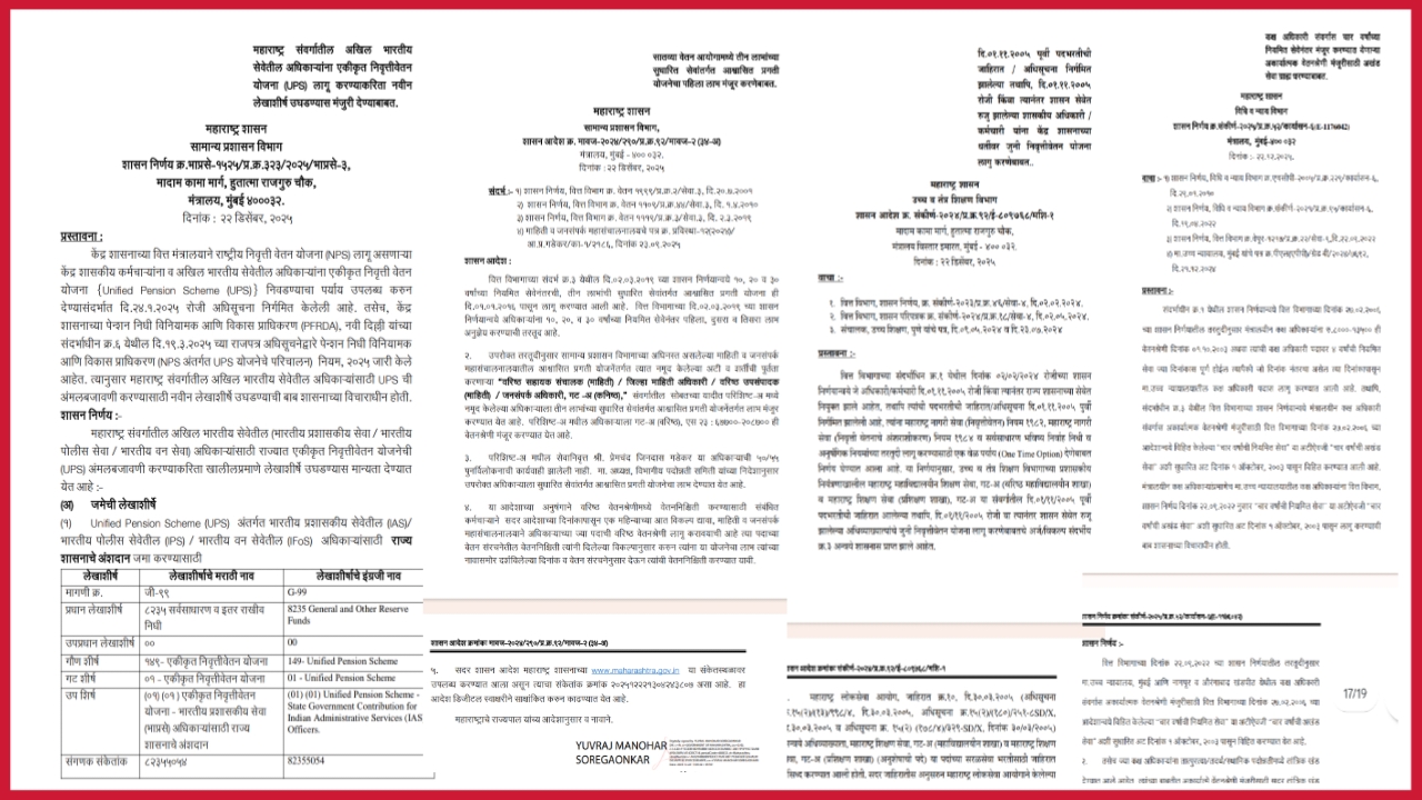 01.एकीकृत निवृत्तीवेतन ( UPS ) लागु करणेबाबत : महाराष्ट्र संवर्गातील आ.भारतीय सेवा मधील कार्यरत अधिकाऱ्यांना एकीकृत निवृत्तीवेतन योजना ( UPS ) लागु करणेकरीता नविन लेखाशीर्ष उघडण्यास मंजूरी देणेबाबत सामान्य प्रशासन विभाग मार्फत दिनांक 22.12.2025 रोजी मंजूरी देण्यात आली आहे .