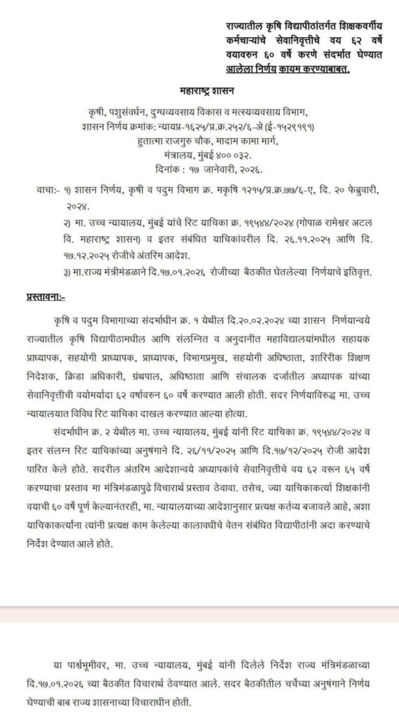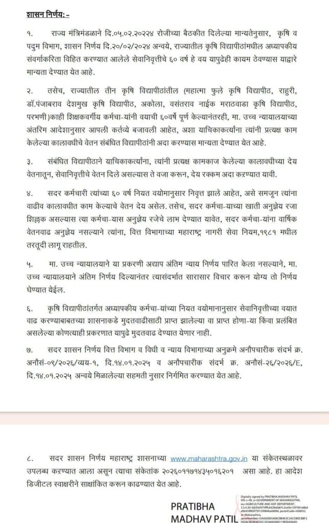 विहीत करण्यात आलेले सेवानिवृत्तीचे वय हे 60 वर्षे हे वय यापुढेही कायम ठेवण्यास सदर शासन निर्णयाद्वारे मान्यता देण्यात येत आहे . सदरचा निर्णय हे राज्यातील तीन कृषी विद्यापीठांतील काही शिक्षकवर्गीय कर्मचाऱ्यांनी वयाची 60 वर्षे पुर्ण केल्याच्या नंतरही मा.उच्च न्यायालयाच्या अंतरिम आदेशानुसार ..