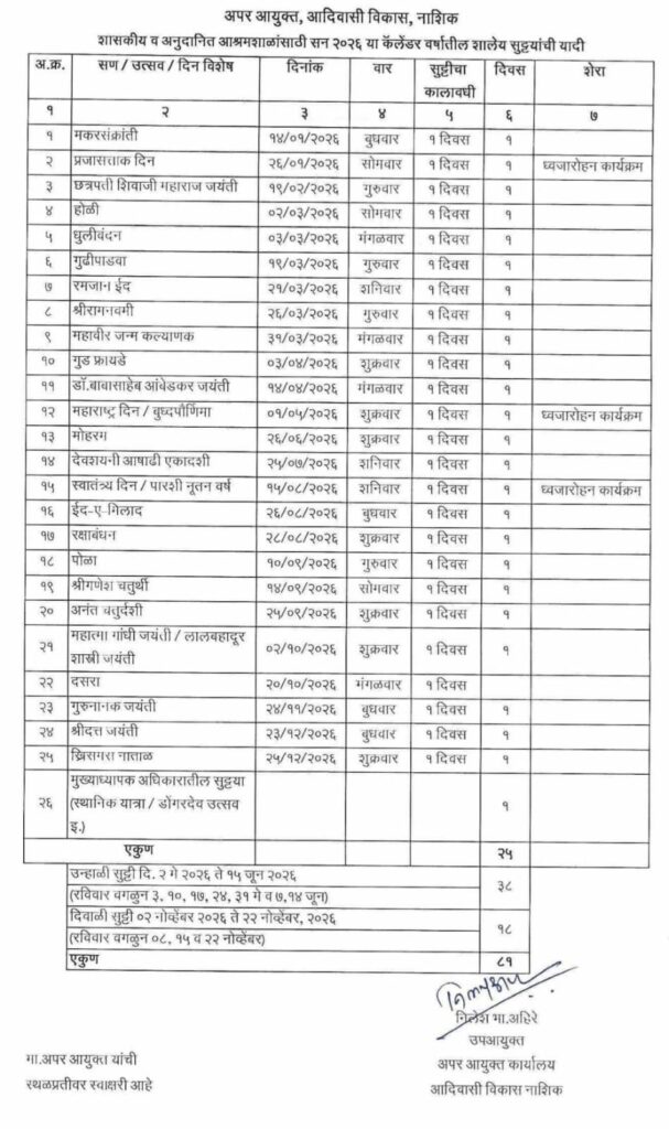@marathiprasar चंदना पवार प्रतिनिधी [ List of school holidays for the year 2026 (Diwali, Summer, Other Public); See details.. ] : सन 2026 या वर्षातील शाळांना सुट्टीची यादी अप्पर आयुक्त आ.विकास विभाग नाशिक मार्फत जाहीर करण्यात आलेली आहे . सविस्तर यादी पुढीलप्रमाणे पाहु शकता .