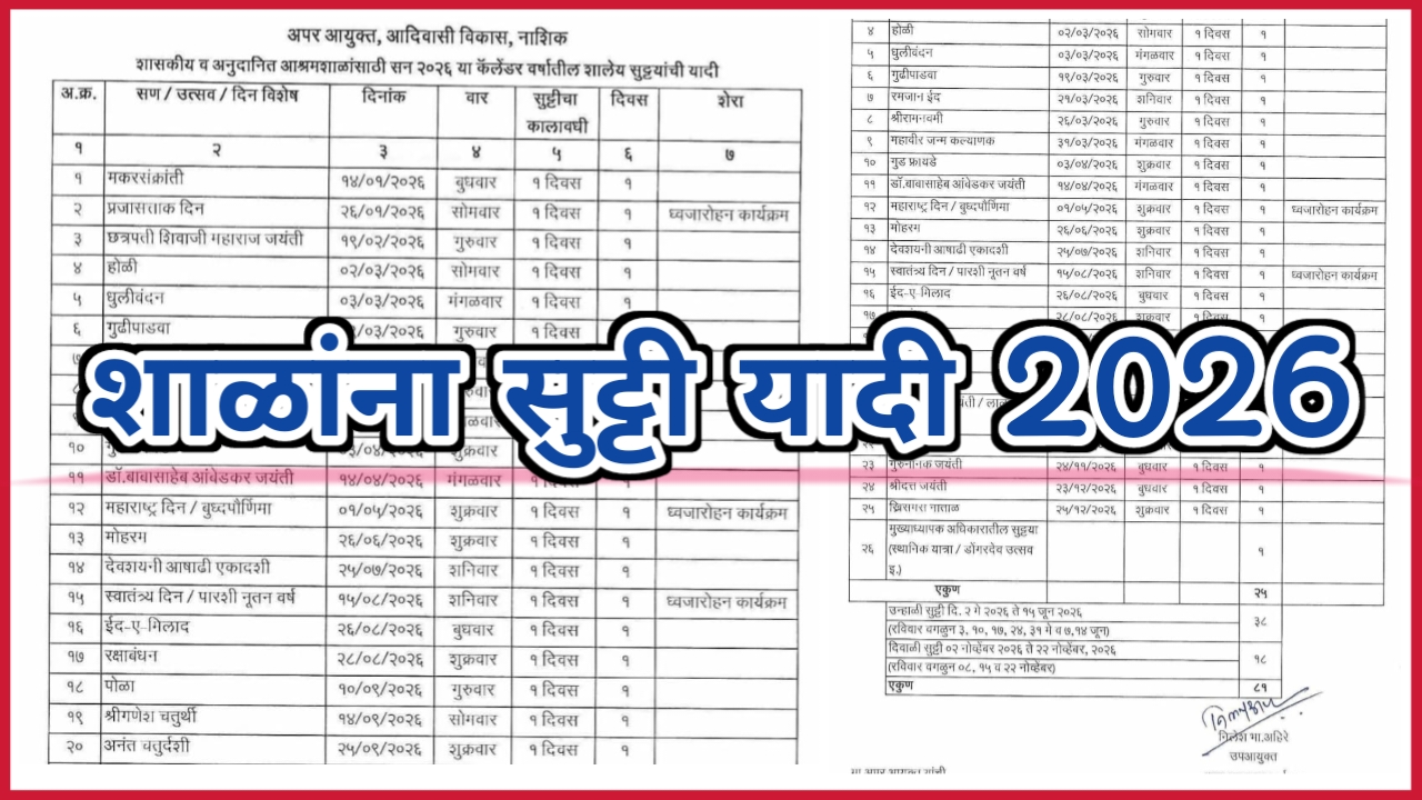 - सन 2026 या वर्षातील शाळांना सुट्टीची यादी ( दिवाळी , उन्हाळी , इतर सार्वजनिक ) ; पाहा सविस्तर !