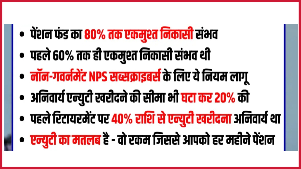 80 टक्के रक्कम काढणे शक्य : राष्ट्रीय पेन्शन योजना अंतर्गत सामील असणाऱ्यांना पुर्वीच्या नियमांनुसार निवृत्तीनंतर केवळ 60 टक्के रक्कम काढता येत होती . परंतु आता नविन नियमांनुसार संचित रक्कमेच्या 80 टक्के रक्कम काढता येणार आहे .