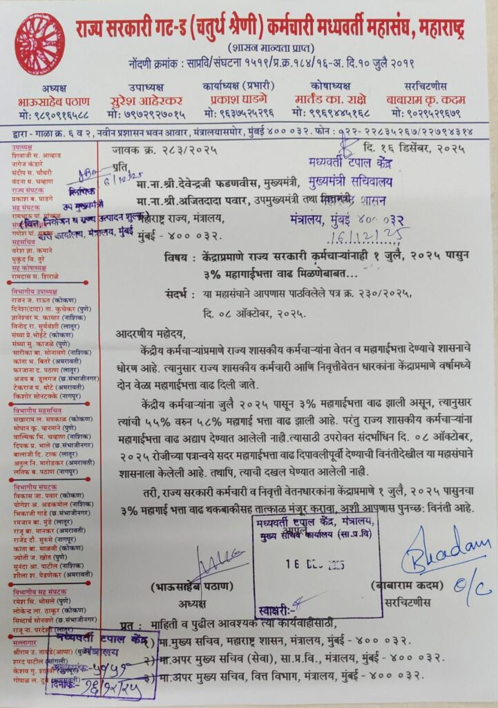 तरी राज्य सरकारी कर्मचारी व निवृत्ती वेतन धारकांना केंद्र सरकार प्रमाणे दि.01.07.2025 पासुनचा 3 टक्के डी.ए वाढ तात्काळ थकबाकीसह तात्काळ मंजूर करण्याची विनंती राज्य सरकारी गट ड ( चतुर्थश्रेणी ) कर्मचारी मध्यवर्ती महासंघ महाराष्ट्र संघटना मार्फत करण्यात आलेली आहे .