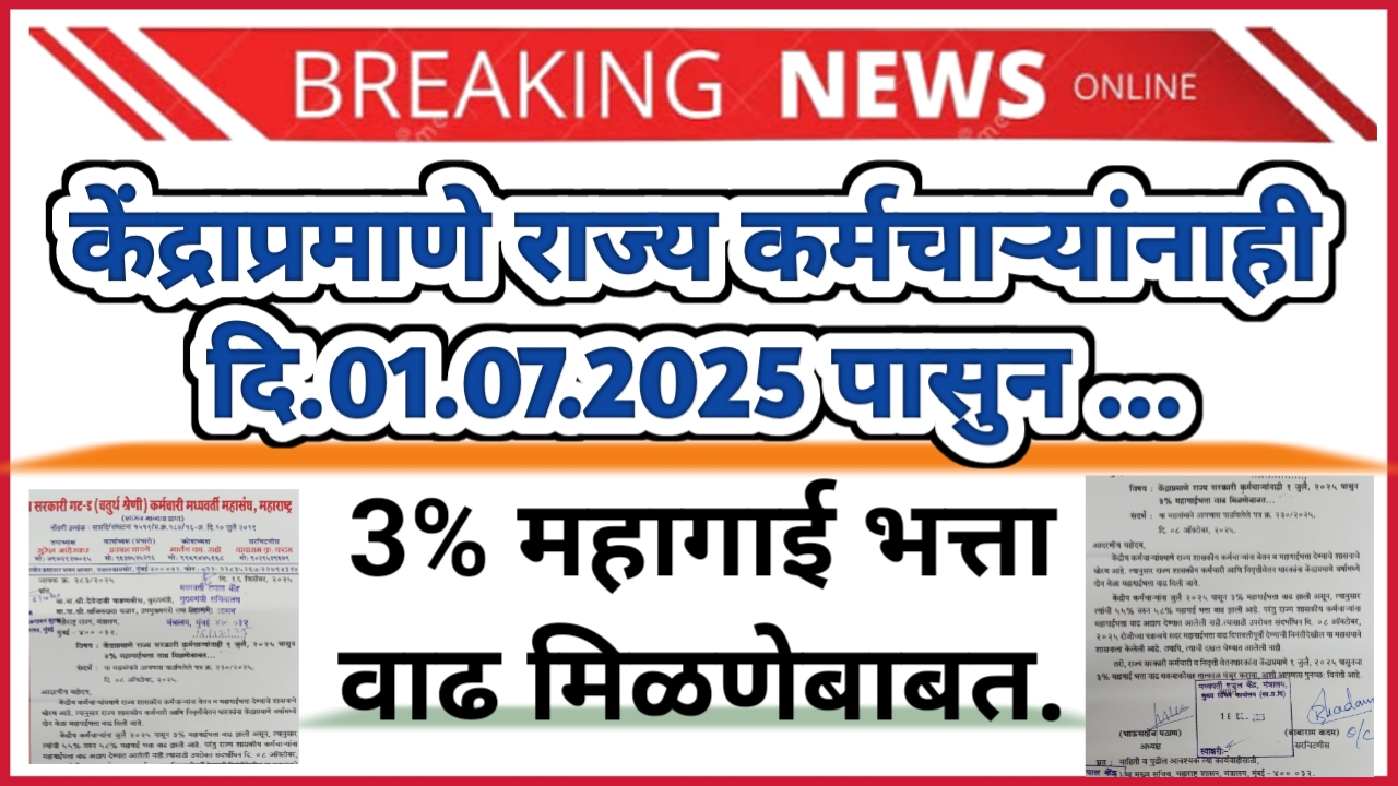 तरी राज्य सरकारी कर्मचारी व निवृत्ती वेतन धारकांना केंद्र सरकार प्रमाणे दि.01.07.2025 पासुनचा 3 टक्के डी.ए वाढ तात्काळ थकबाकीसह तात्काळ मंजूर करण्याची विनंती राज्य सरकारी गट ड ( चतुर्थश्रेणी ) कर्मचारी मध्यवर्ती महासंघ महाराष्ट्र संघटना मार्फत करण्यात आलेली आहे .